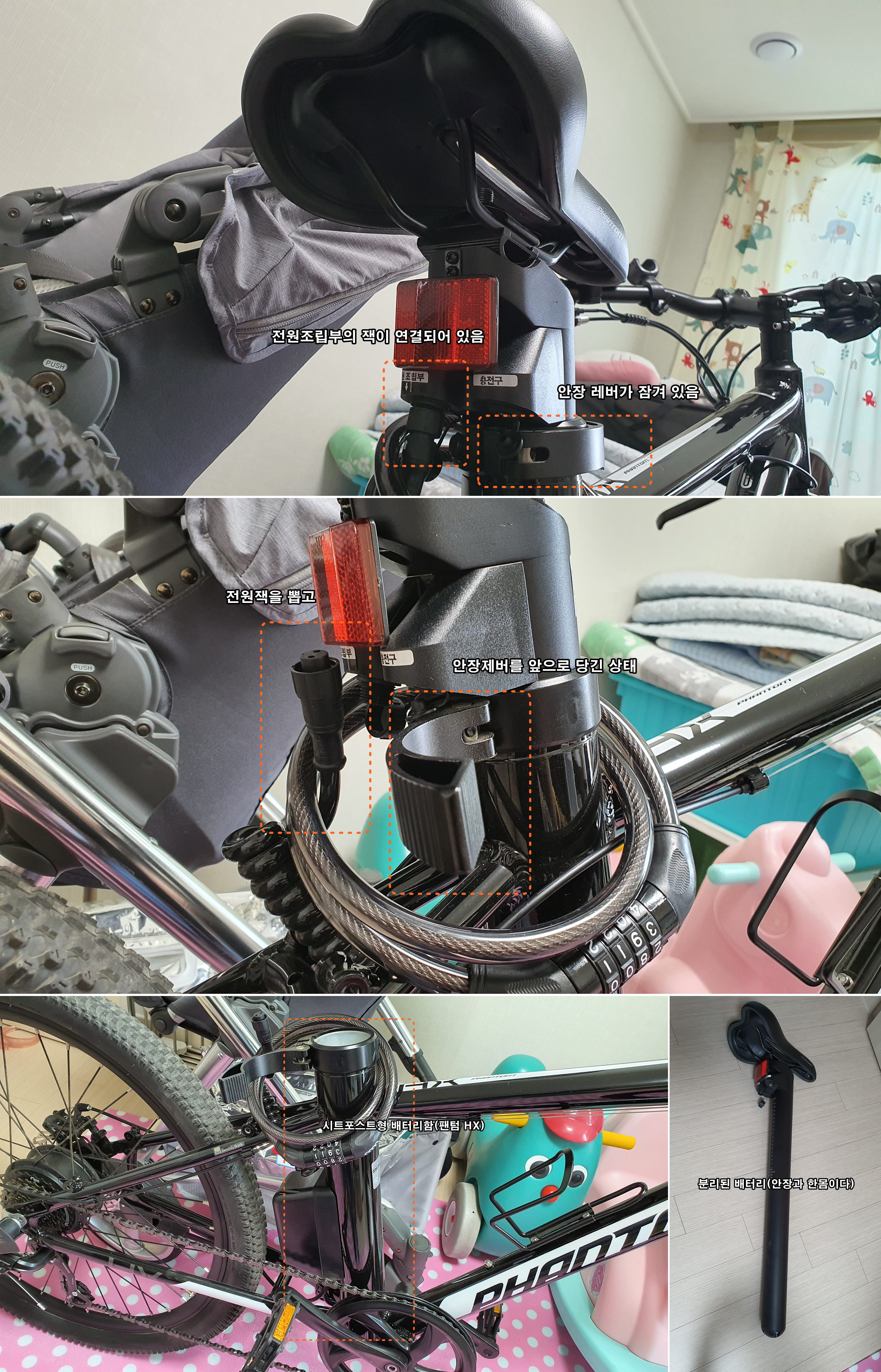 팬텀 HX 기종은 경량화를 위해 '시트포스트형' 배터리를 적용하여 안장봉 내부에 배터리를 보관하는 방식이다.